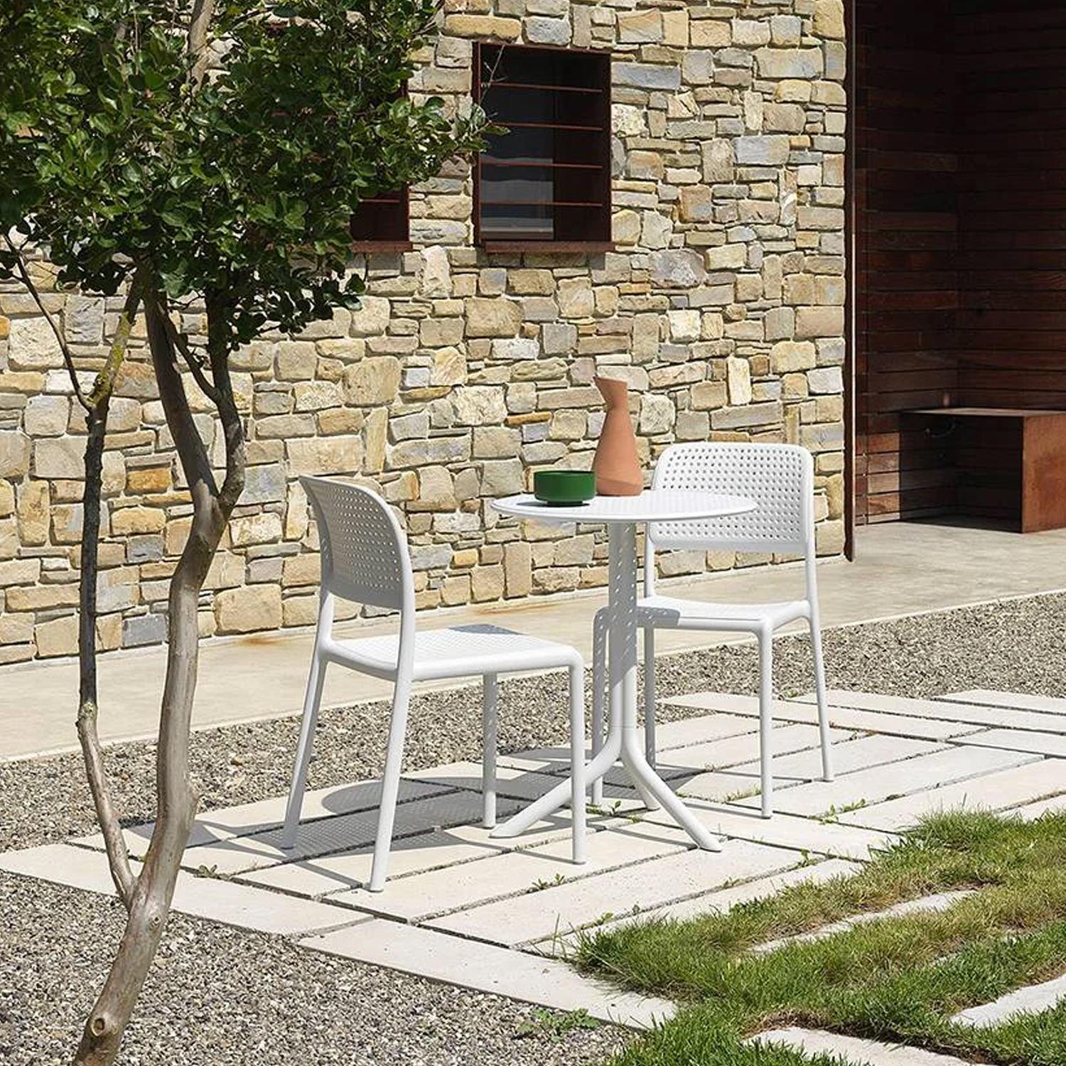 Bora Bistrot Nardi chair it is available in two colours: anthracite or turtledove. The perforated backrest makes the seat breathable and is designed to resist both atmospheric agents and UV rays over time.