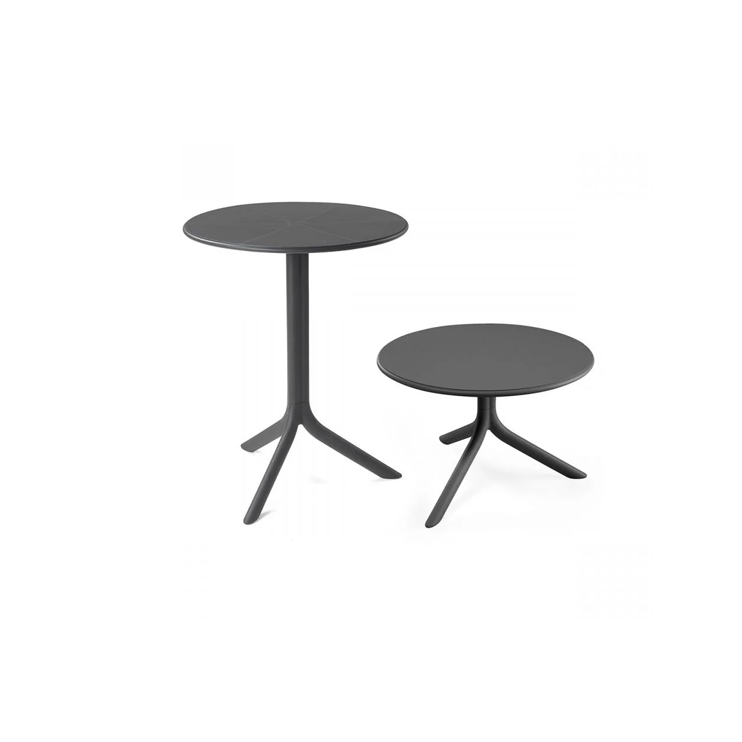 Nardi White Spritz Table in fiberglass polypropylene and smooth round top diameter 60.5cm. It is characterized by its central leg, and the possibility of being adjusted two heights: standard H 73 cm and mini H 40 cm.