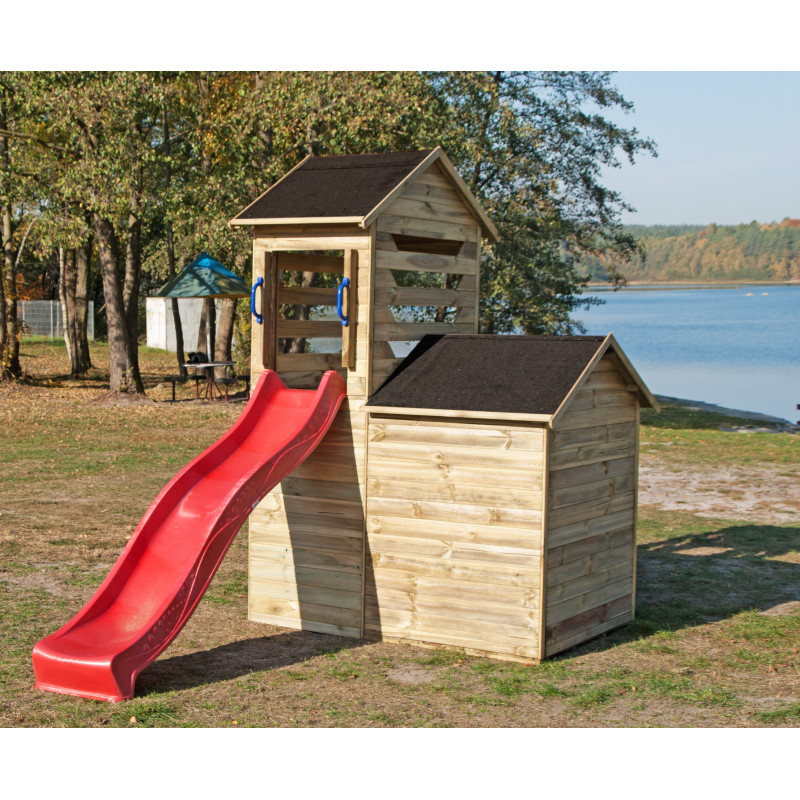 Lo scivolo accanto alla casa è un altro indiscutibile vantaggio. L’elemento è realizzato in resistente plastica HDPE, rendendolo resistente alle diverse condizioni meteorologiche, sia ai raggi solari intensi che alle lunghe piogge. Grazie allo scivolo, non sarà necessario visitare un parco giochi distante da casa, e tuo figlio potrà invitare i suoi amici a casa sua. I due piani e lo scivolo permettono a diversi bambini di giocare contemporaneamente nella casa di legno.