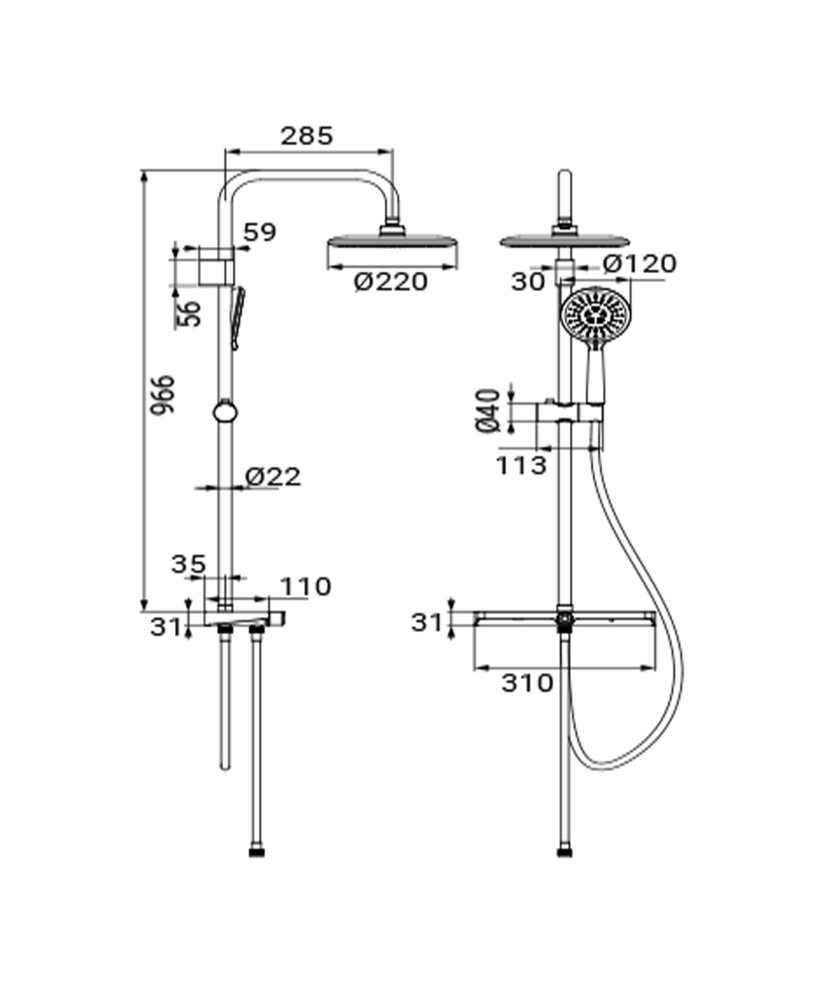 - Soffione: In ABS cromato, diametro Ø 22 cm, con 1 getto anticalcare
