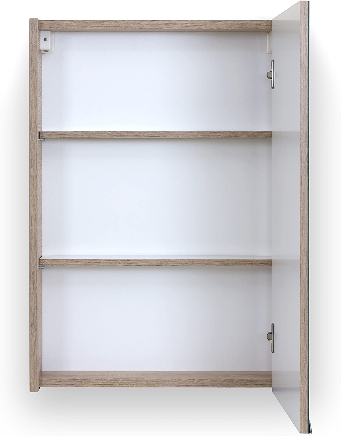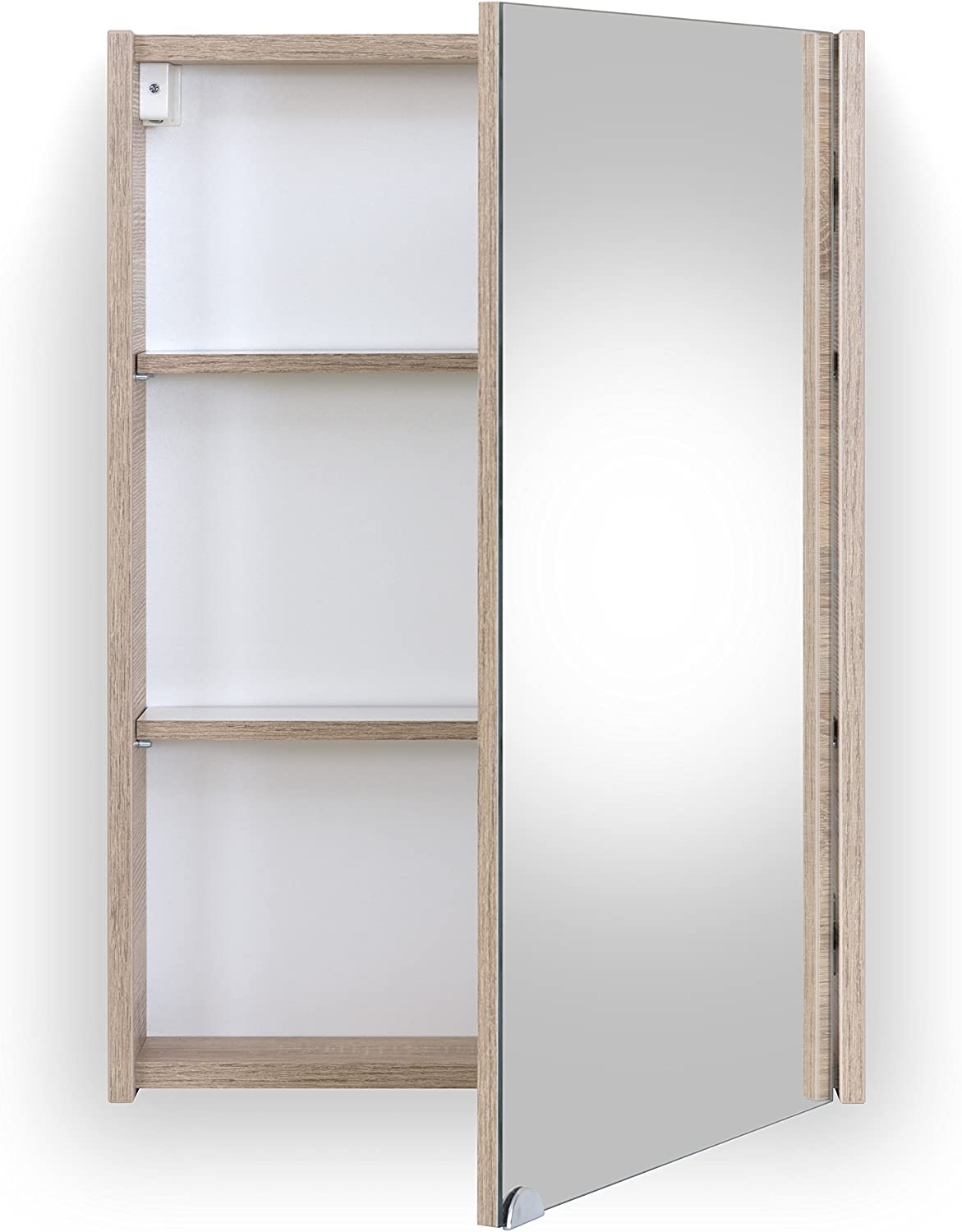 Specchio con anta Brand, pratico specchio contenitore nel colore rovere chiaro, un accessorio ideale per creare nel tuo bagno nuovi spazi dove riporre i tuoi cosmetici e prodotti per l’igiene quotidiana e tenerli a portata di mano in qualsiasi momento. Largo 50 cm, è fornito di un’unica anta a specchio con chiusura rallentata che evita chiusure brusche, è provvisto di mensole in vetro rimovibili e riposizionabili a seconda dell’altezza e dello spazio desiderati. Il materiale del mobiletto, oltre ad essere molto piacevole alla vista, è anche molto pratico perché durevole e resistente, anche all’acqua.